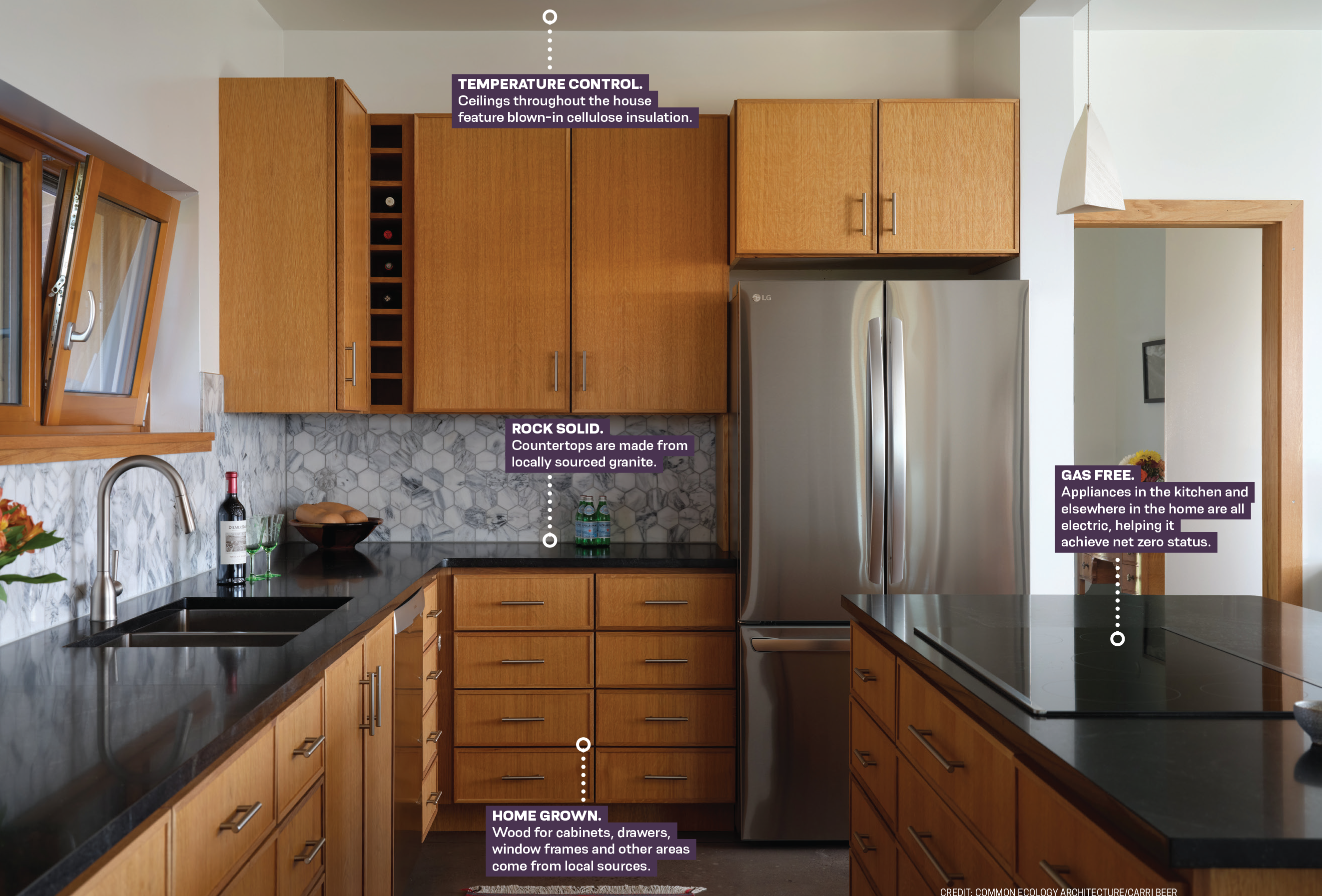 The cedar used in the home’s siding and oak used for the floors, doors, cabinets, built-ins and trim are from locally felled trees. Credit: Common Ecology Architecture/Carri Beer