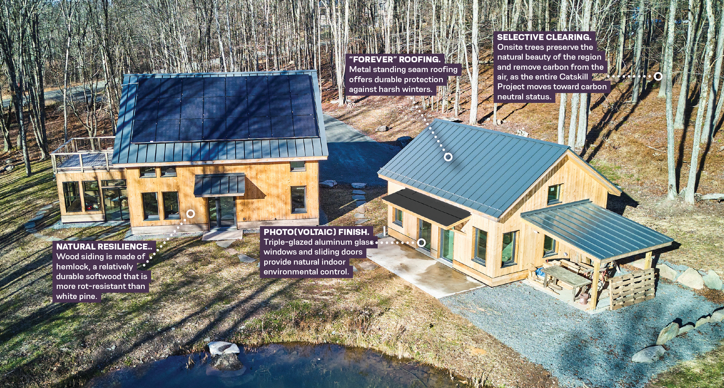 That’s not to say that the Catskills’ trees pull all of the weight when it comes to the project’s sustainability. Each of the homes—Red Hill chief among them—is a leader in environmentally conscious practices in its own right.